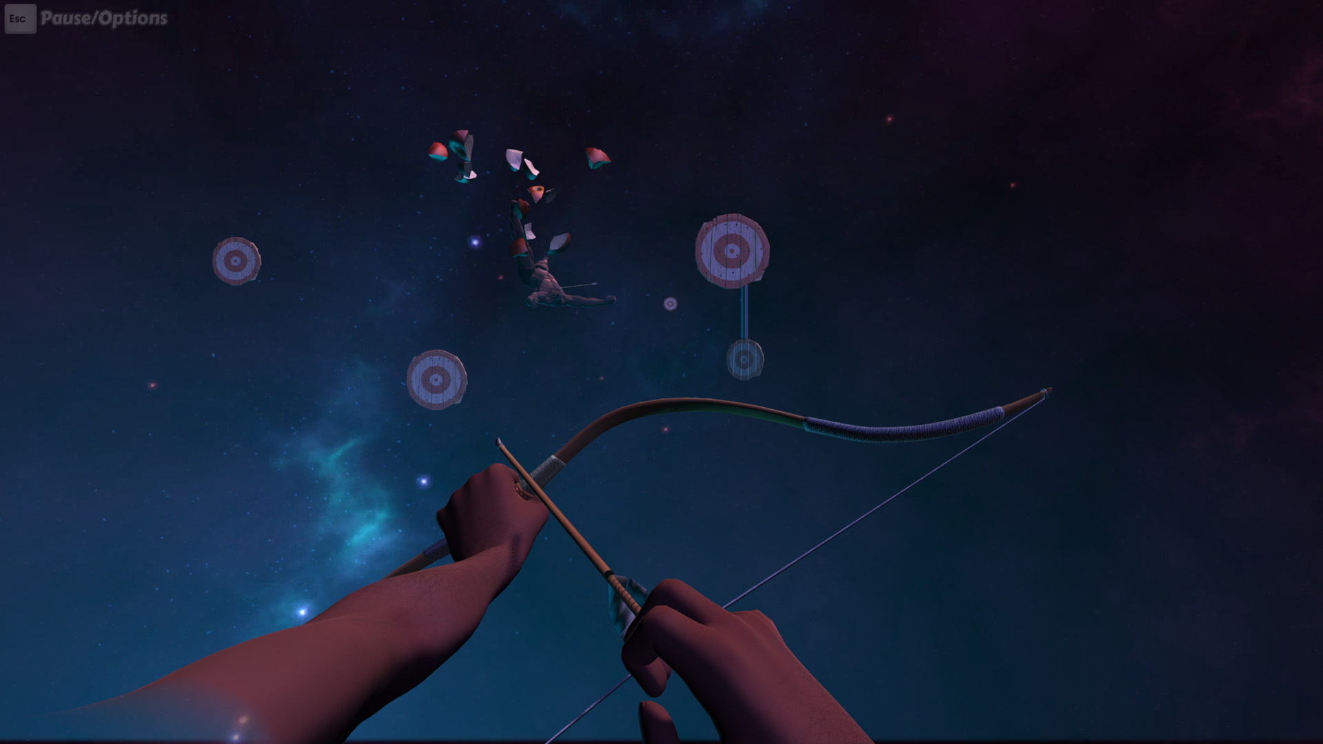 Manipulate your wrists, elbows and shoulders to get the arrow to the bow, draw it, aim and fire!